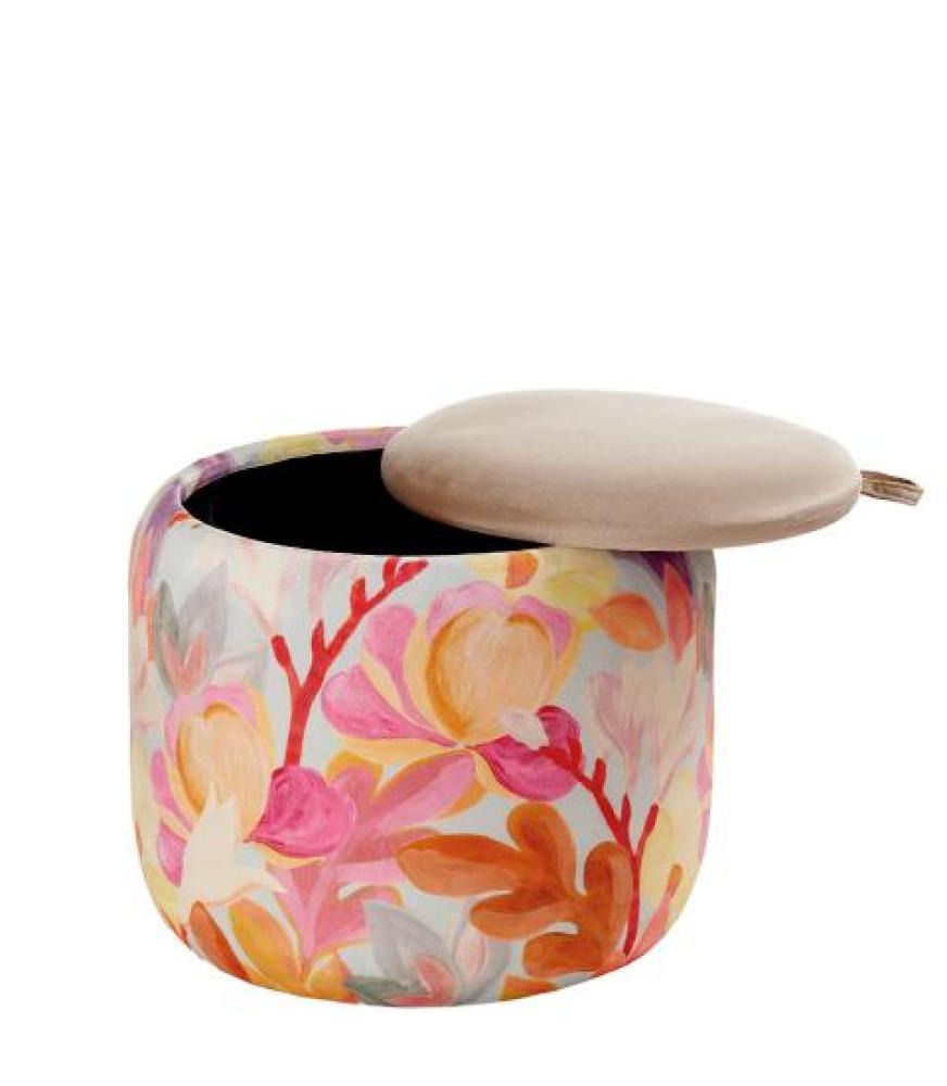 Pouf con decoro floreale e seduta tinta unita. Dimensioni: Ø43x38h Materiale: tessuto di poliestere - struttura MDF